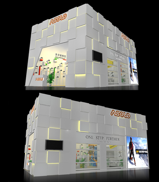 2015北京ISPO展会,阿索罗展台设计效果,封闭式展台结构,外形简洁,内容色彩丰富,结构新颖,吸引人眼球。